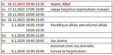 DojoS / joulun ja uuden vuoden harjoitusaikataulu